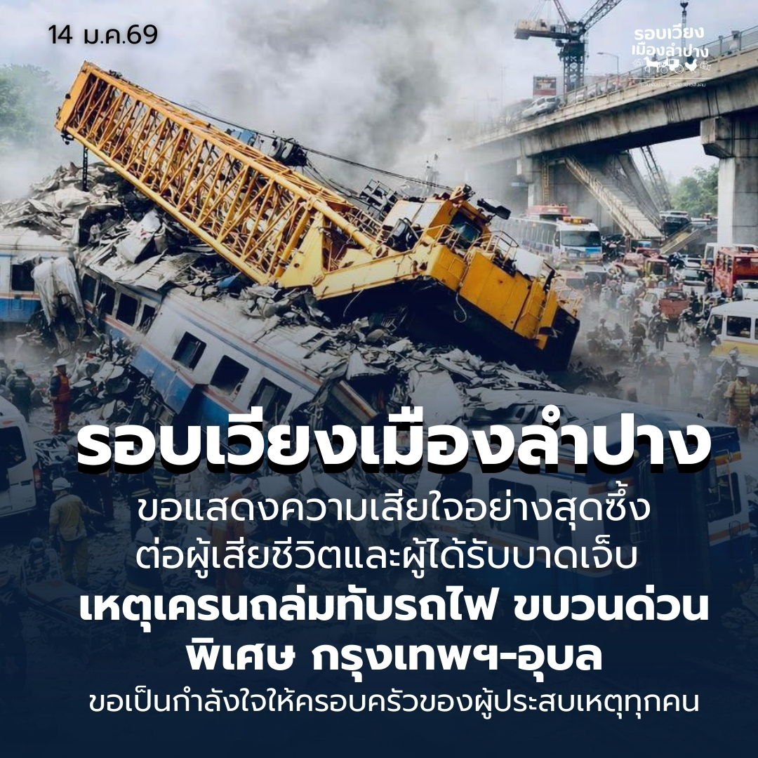 ข่าวสังคมลำปาง รอบเวียงเมืองลำปาง ขอแสดงความเสียใจอย่างสุดซึ้งต่อผู้เสียชีวิต ผู้ได้รับบาดเจ็บ และครอบครัวของผู้ได้รับผลกระทบ จากเหตุการณ์เครนก่อสร้างถล่มทับขบวนรถไฟ ในพื้นที่อำเภอสีคิ้ว จังหวัดนครราชสีมา บรรณาธิการ ข่าว ม.ค. 14, 2569 0 รอบเวียงเมืองลำปาง ข… อ่านรายละเอียด
