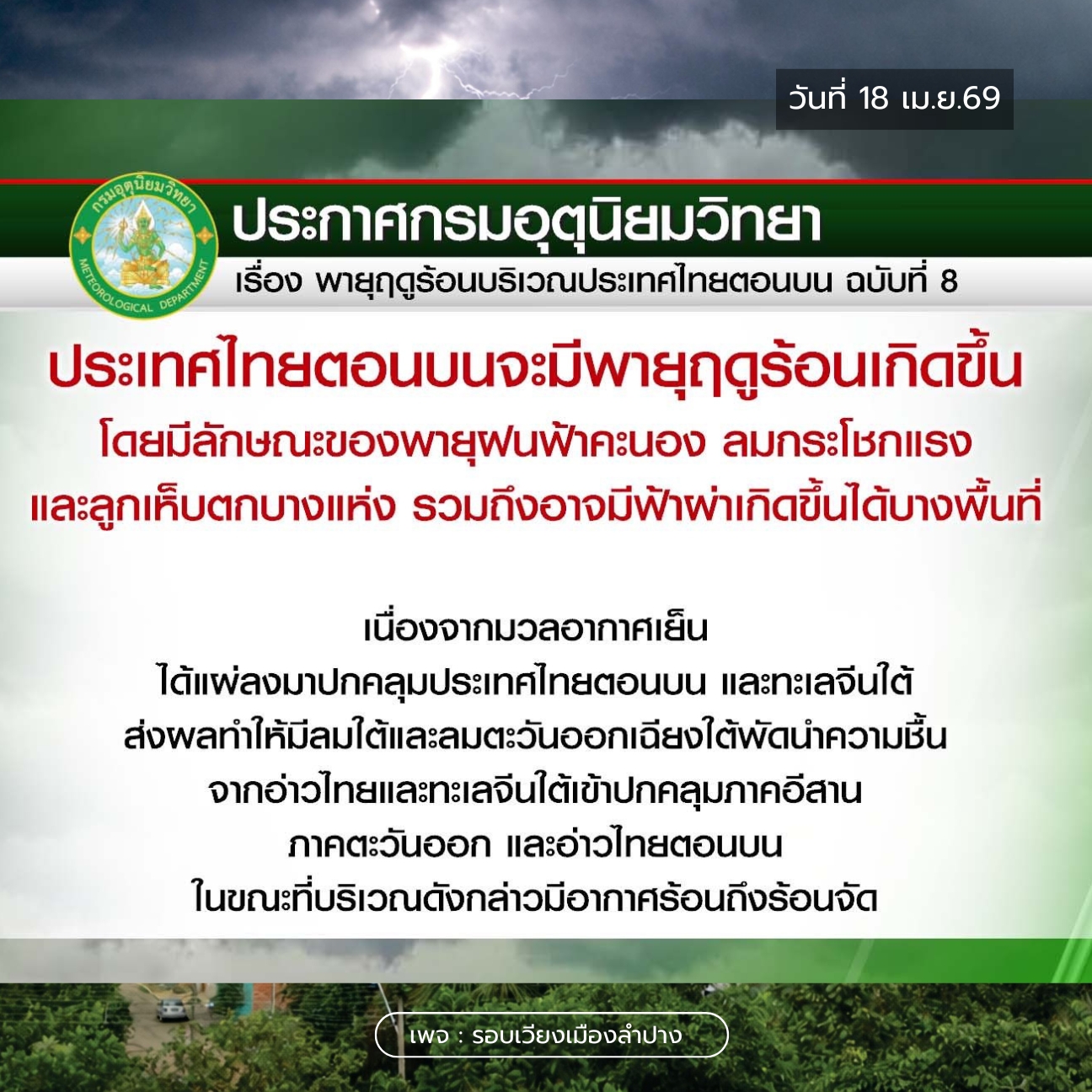 ข่าวบริการ ลำปางเฝ้าระวังติดตามพยากรณ์อากาศอย่างต่อเนื่อง กรมอุตุฯ เตือนพายุฤดูร้อนในระยะนี้ lampang-360 เม.ย. 18, 2569