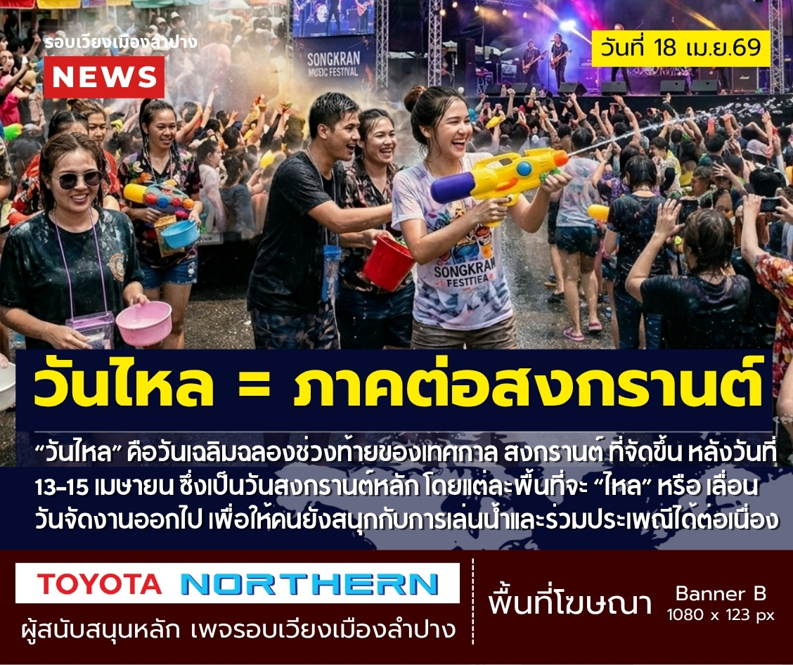 ข่าวท้องถิ่นลำปาง ข่าวบริการ ข่าวสังคมลำปาง ข่าวสารวาไรตี้ วันไหล = “ภาคต่อสงกรานต์”เป็นการสืบสานวัฒนธรรม + เพิ่มความสนุกให้ยาวขึ้นในแต่ละท้องถิ่นนั้นๆ lampang-360 เม.ย. 18, 2569