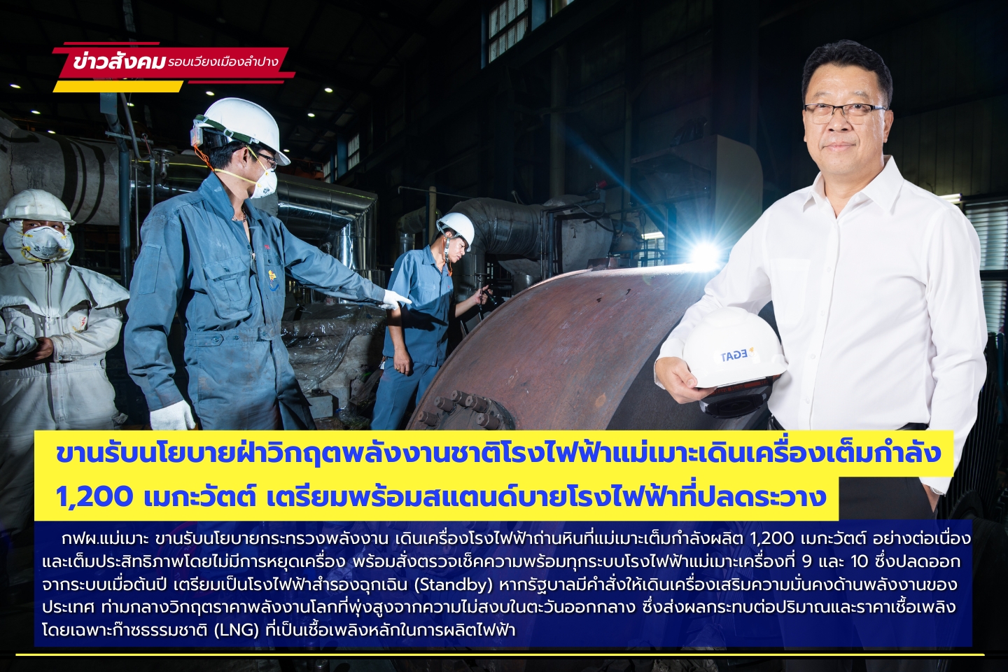ขานรับนโยบายฝ่าวิกฤตพลังงานชาติโรงไฟฟ้าแม่เมาะเดินเครื่องเต็มกำลัง 1,200 เมกะวัตต์ เตรียมพร้อมสแตนด์บายโรงไฟฟ้าที่ปลดระวาง